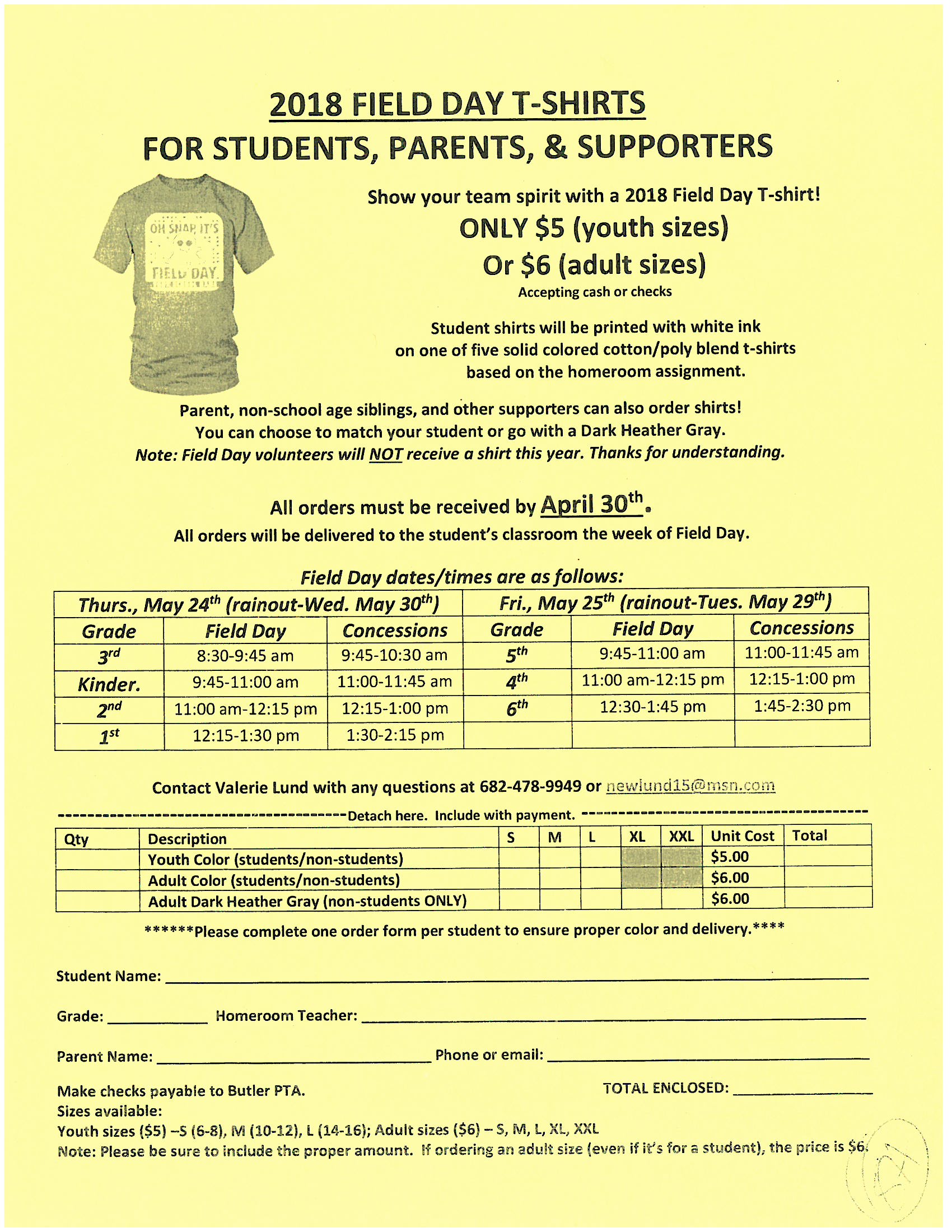 Posted on by ButlerPTA « All Events This event has passed. Last day to order Field Day T-shirts April 30, 2018 Event Navigation « Last day to order yearbooks online! PTA Meeting » Please be sure to return your order forms by today! All orders will be delivered to students’ classrooms the week of Field Day. + Google Calendar+ iCal Export Details Date: April 30, 2018