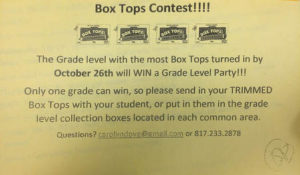 Turn in those Box Tops for Education! The grade level with the most Box Tops turned in by today will win a grade-level party! Send in your trimmed Box Stops with your student to school, or put them in the grade-level collection boxes located in each grade's common area. Questions? Contact carolyndove@gmail.com or 817.233.2878.