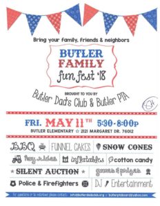Calling all Broncos, their families, friends and our community neighbors! Come one, come all to the Butler Family Fun Fest, hosted by Butler Dad's Club and PTA. Join us for BBQ, funnel cakes, snow cones, hay rides, inflatables, silent auction, games & prizes and entertainment. You are not going to want to miss this incredible Butler tradition! This year, you can buy your tickets online and pick them up that night at the Fun Fest! To purchase tickets, click here: https://squareup.com/store/butler-elementary-pta.